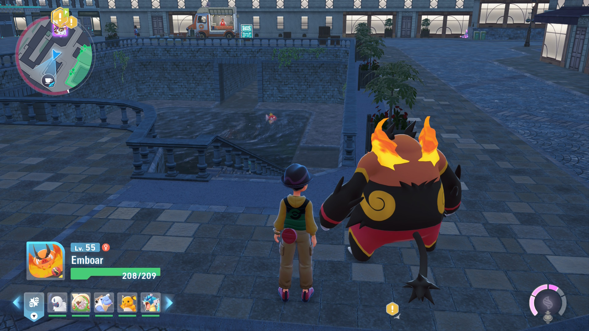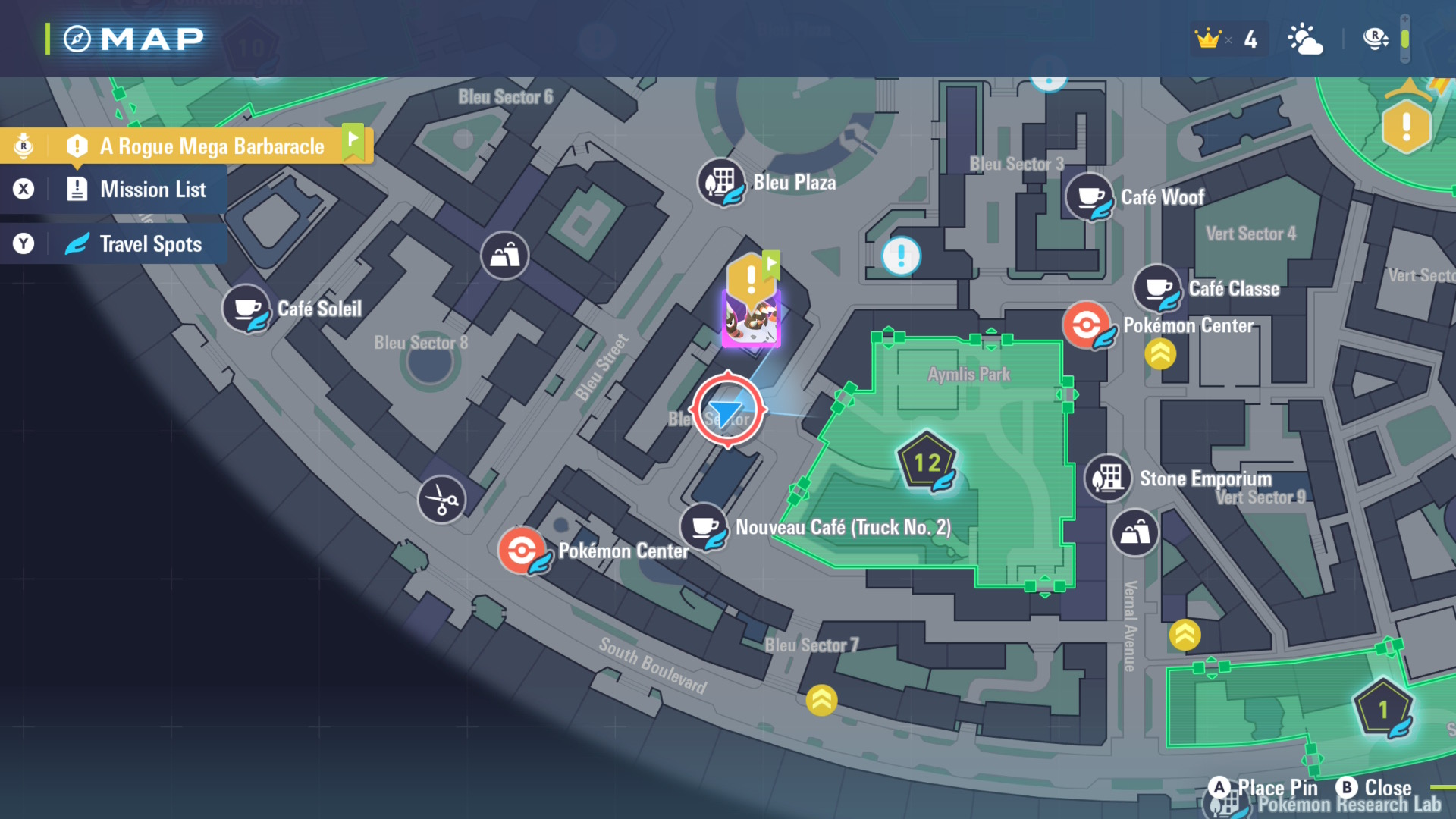 Your destination is in the Bleu Sector. Fast travel to the Nouvéau Cafe (Truck No. 2) — or the Pokémon Center nearby — to get yourself close.